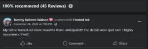 Absolutely had the best experience!!! From the design to the actual tattoo!! Frost is incredible when it comes to design when you bring him your ideas!! My husband and I both love our memorial pieces!! Will definitely return and have found our go to place!!! Thanks Frost and Michelle!!!!!